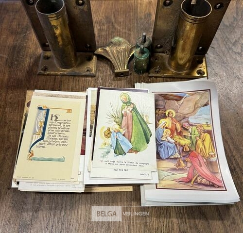 Diverse bidprentjes + 2 messing voetsteunen