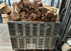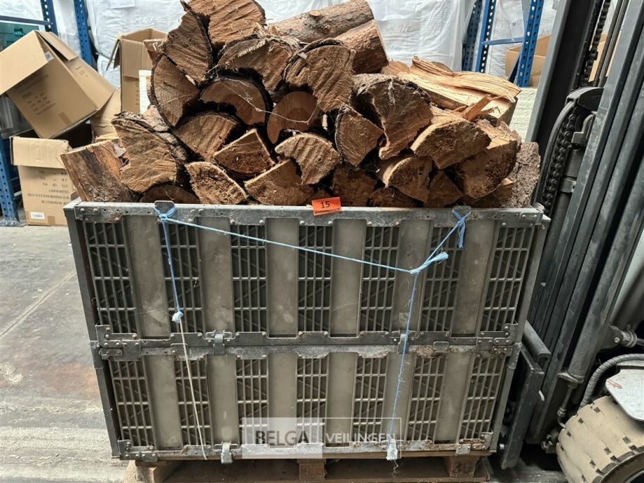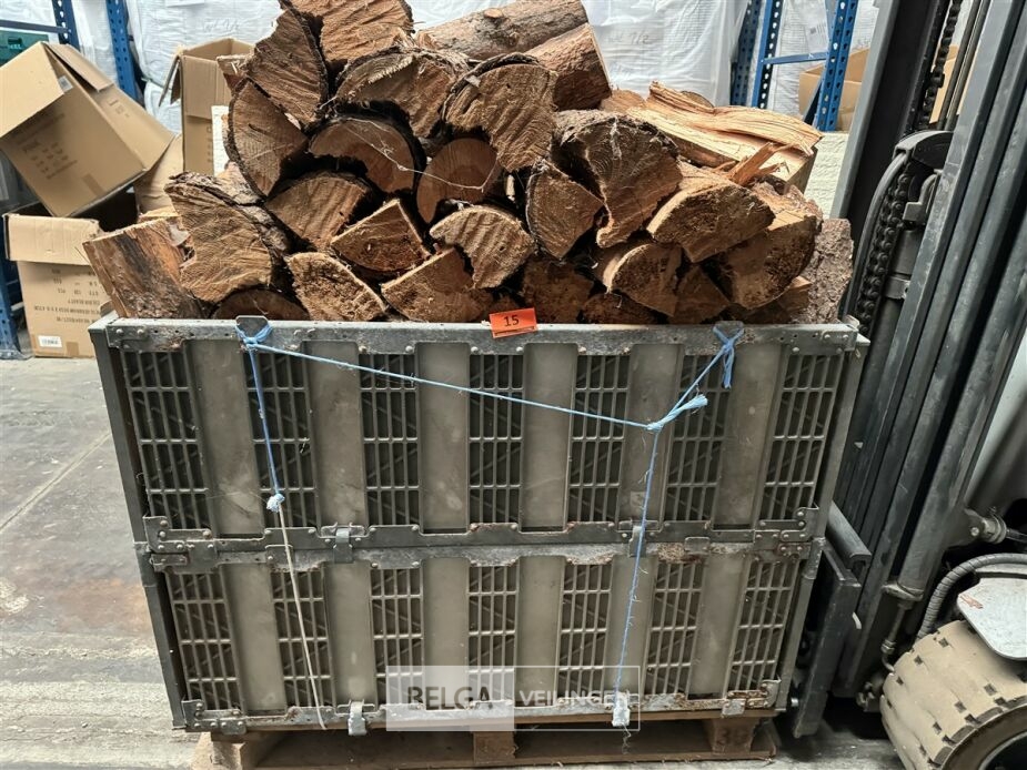 1 bak gedroogd brandhout ± 120x100x85 of 0,80x120x85- palet en bak inbegrepen. De bakken kunnen verschillen van inhoud - soort hout: den, berk of andere soorten volgens afgifte Belgaveilingen.