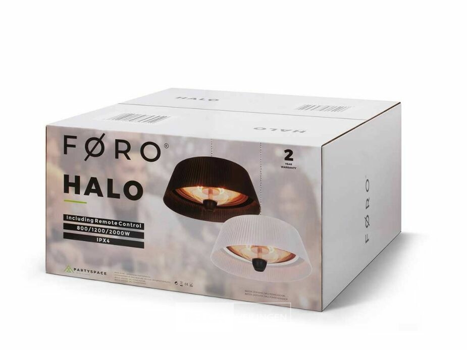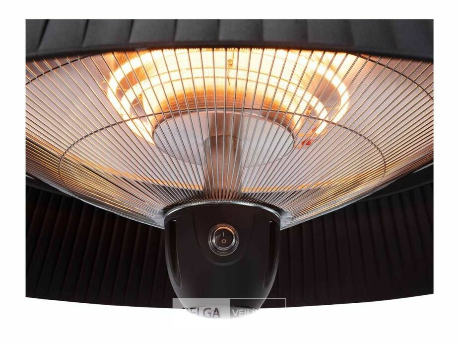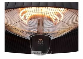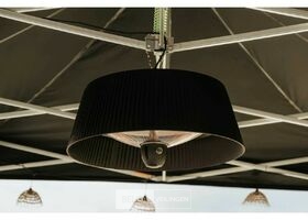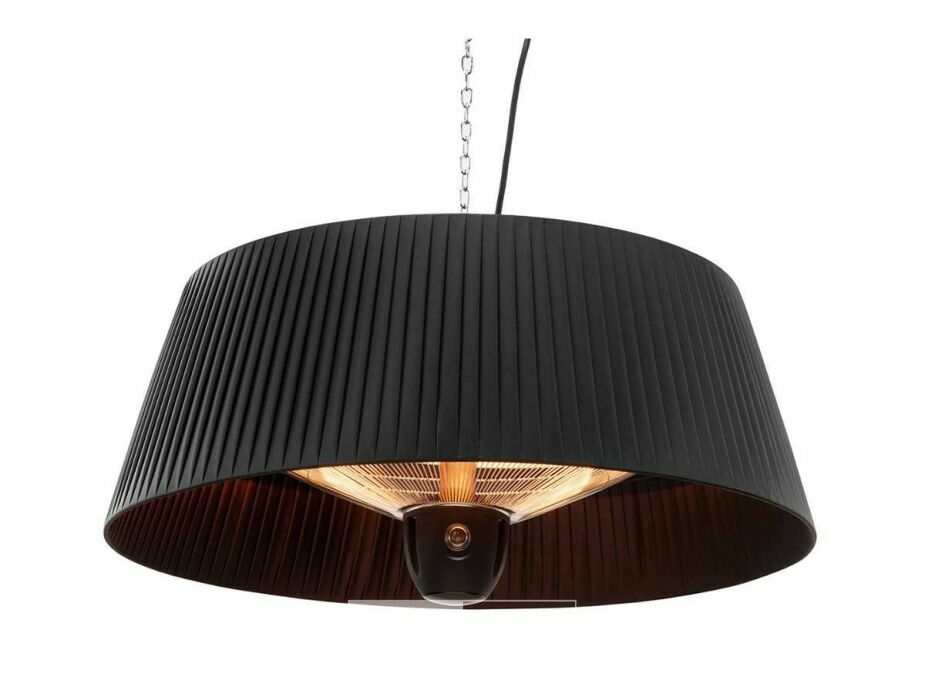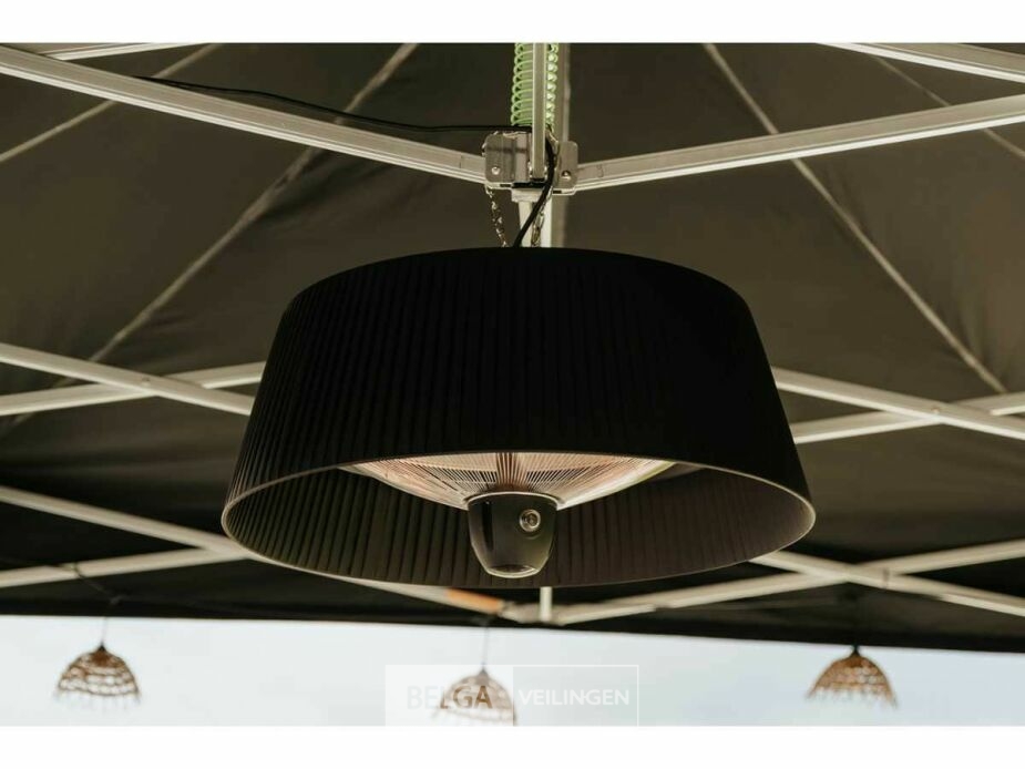 Deze hangende elektrische terrasverwarmer met zwarte kap kan je ophangen in je tent of aan je parasol. Of elders, want er zijn tal van mogelijkheden, aangezien deze verwarmer zowel voor binnen- als buitenshuis gebruik geschikt is. Met de bijgeleverde afstandsbediening kan je de verwarmer gemakkelijk vanuit je stoel bedienen. Dankzij drie warmtestanden kies je zelf hoe veel warmte je wil creëren: 800, 1200 of 2000 Watt. De verwarmer heeft een aluminium behuizing met matzwarte afwerking en is spatwaterdicht (IP-norm: IPX4). Het verwarmingselement heeft een diameter van 42 cm, de kabel heeft een lengte van 1,60 m.