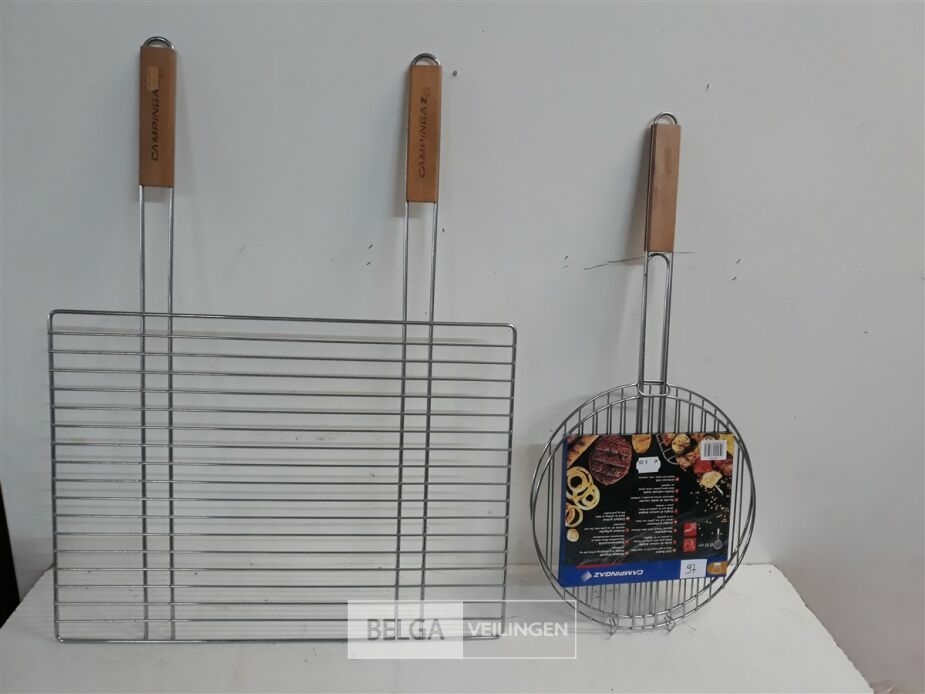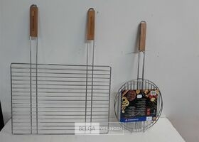 1 x Grillrooster 1 x rond 30 cm houten handvat + 1 x BBQ rooster 53x40 cm met 2 houten handvatten