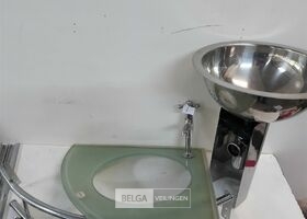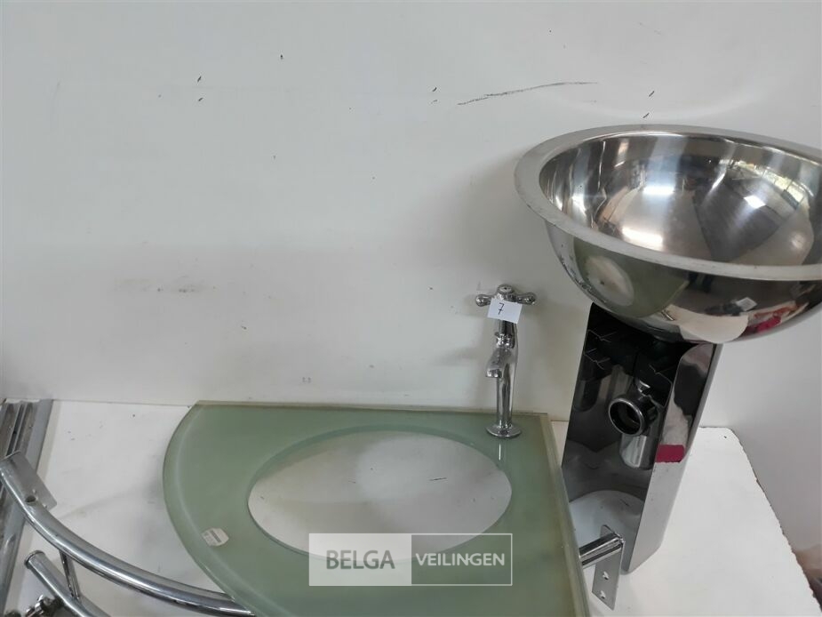 1 x Hoekwasbak inox glazen blad 48 x 48 cm veiligheidsglas met chrome sifon + afdekkap met chrome handdoekrekje met kraan showmodel