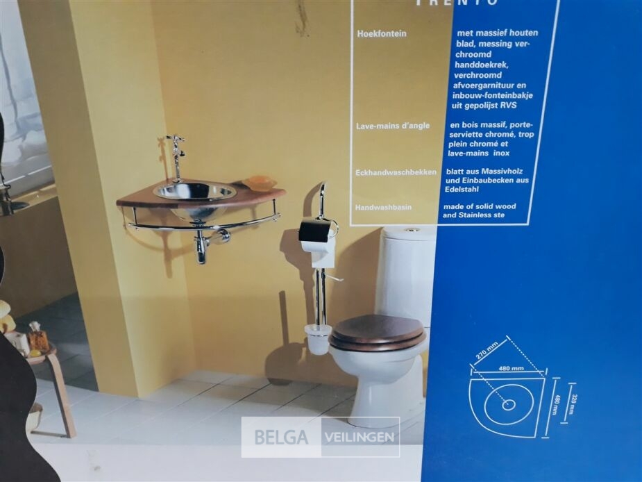 1 x Hoekwasbak inox houten blad 48x48 cm met chrome handdoekrekje + chrome sifon