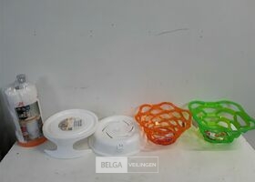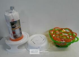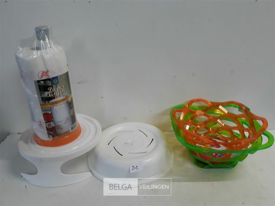 1 x Keukenhulp 5 assorti 1 x Keukenrolhouder met rol + 1 x bordstaander + 1 x afdekkap bord + 2 x fruitmand rond + 2 x fruitmand vierkant