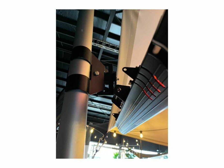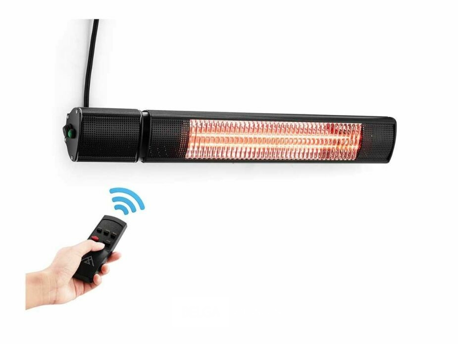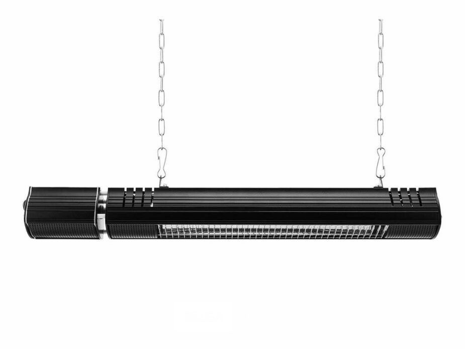 De terrasverwarmer heeft een vermogen van 2000 W en kan een oppervlakte van 6 m² verwarmen. Er is ook een handige afstandsbediening inbegrepen waarmee je vanop afstand de intensiteit kan veranderen. Er zijn 3 standen voorzien op het toestel: laag 1000 W, gemiddeld 1500 W, hoog 2000 W. De infrarood terrasverwarmer moet minimum op 1,8 m hangen, de ideale hoogte is 2,4 m. Deze wandheater is voorzien van golden tube infrarood halogeen lampen met een levensduur van 5000 tot 7000 uur. De behuizing van de verwarmer bestaat uit zwart gepoedercoat staal. Het toestel kreeg een IP-certificering van 65 d.w.z. dat het stof- en waterbestendig is. Deze infrarood terrasverwarmer kan dus zeker een regenbui verdragen en is daardoor helemaal outdoor proof. Alle accessoires (schroeven, beugels en ketting) om de wandheater op te hangen zijn inbegrepen. De terrasverwarmer wordt geleverd met een beugel. De beugel is ideaal om de terrasverwarmer op te hangen aan ronde palen.
