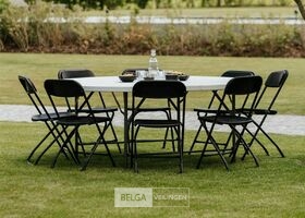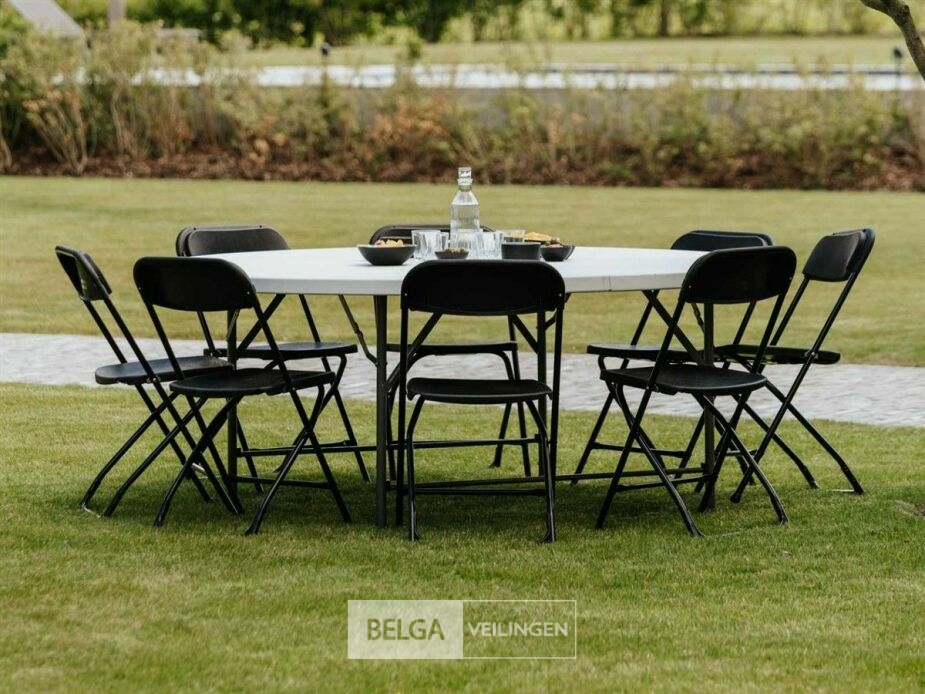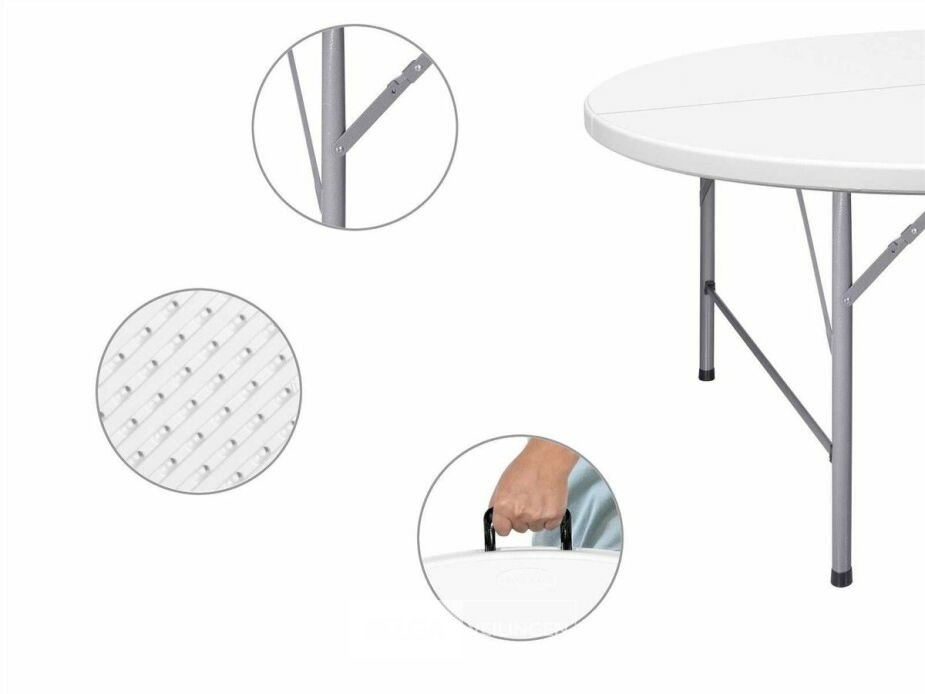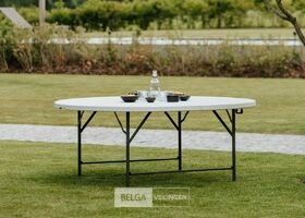 Onze ronde buffettafel is perfect voor elk feestje, je creëert snel en gemakkelijk extra ruimte. Deze tafel is stevig, maar licht en bovendien compact samen te vouwen. De buffettafel kan snel opgeborgen worden en is gemakkelijk in onderhoud. Het tafelblad bestaat uit HDPE (hoge dichtheid polyetheen) met een dikte van 4,5 cm. Het frame is gemaakt uit gepoedercoat staal met een hamerslag design.