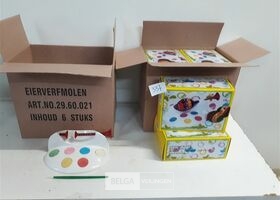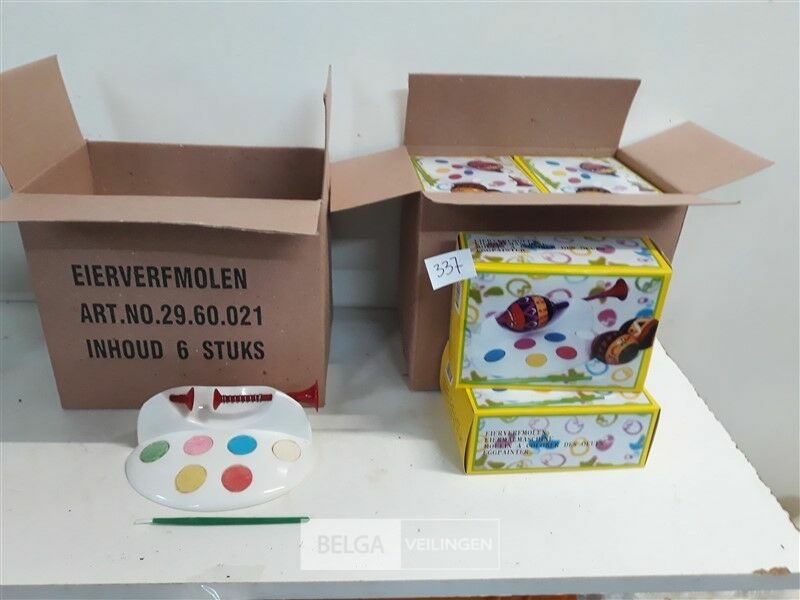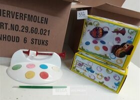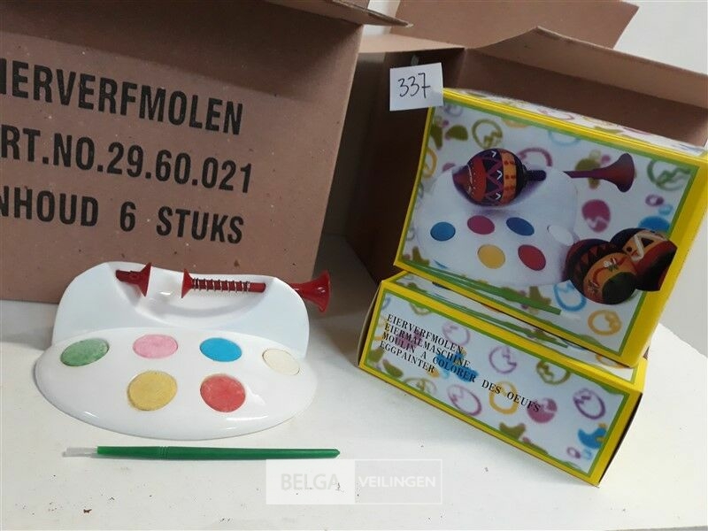 12 x Ei- verfmolen met penseel en verf (kwaliteit verf niet gekend)