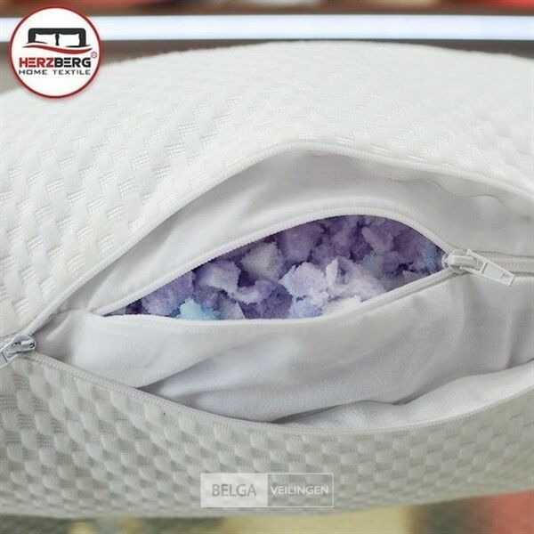 Set van 2 hoogwaardige kussens van versnipperd traagschuim. Temperatuurbalancerend, hypoallergeen, huisstofmijtvrij. Afneembare, machinewasbare kussenslopen.