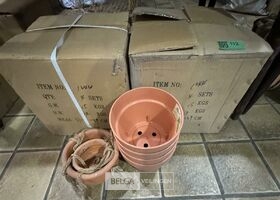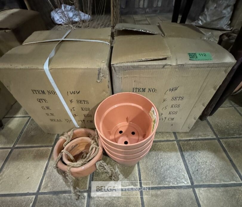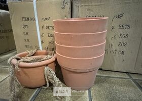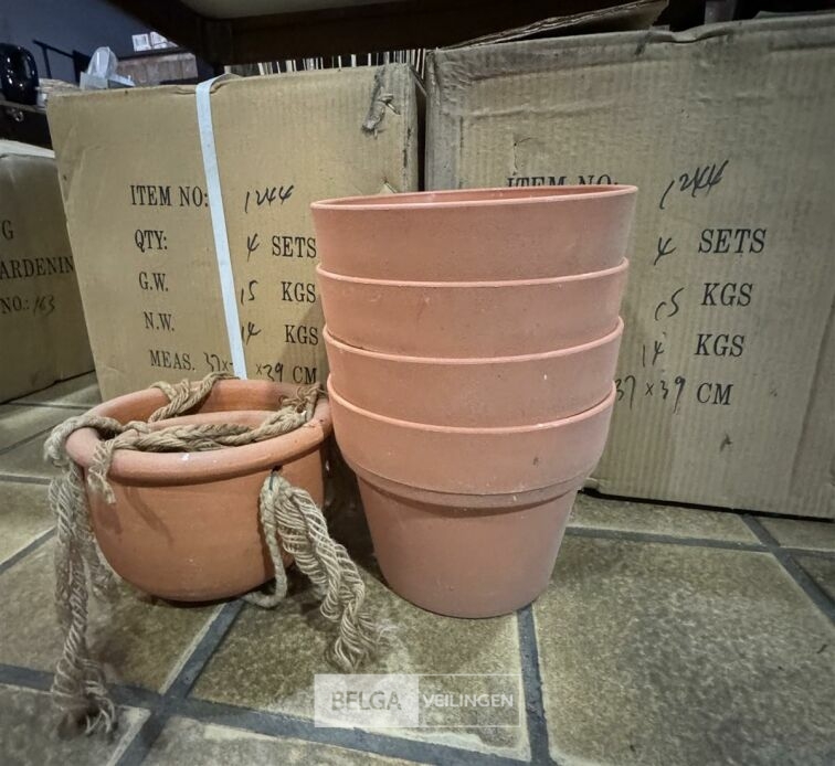 2 dozen terracotta wandbloempotten + 4 ronde plastieken bloempotten + 2 terracotta hangbloempotten - Bestaande uit 8 sets in totaal ( 4 sets van 2 per doos) - afmtingen (20 cm x 10 cm x 10 cm en 35 cm x 17 cm 17 cm) / ronde plastieken bloempotten (hoogte 16 cm diameter 20 cm)