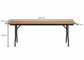 Deze uiterst professionele buffettafel is snel opzetbaar en kan dankzij de inklapbare poten compact opgeborgen worden. De tafel is 76 cm hoog en het tafelblad uit multiplex van 18 mm dik meet 220 x 76 cm. Het stevige frame is gemaakt uit buizen uit gegalvaniseerd en gecoat staal met een diameter van 32 mm en een wanddikte van 2 mm. Dankzij de metalen steunbar in het midden is de tafel extra sterk en kan deze tot wel 200 kg gewicht dragen. De buffettafel is gemakkelijk in onderhoud en stootvast en heeft bovendien een speciale coating gekregen zodat de tafel ook buiten gebruikt kan worden. Je laat de tafel echter wel beter niet het hele jaar buiten staan. De klaptafel is snel opzetbaar en kan compact gestockeerd worden dankzij zijn opbergdikte van slechts 6 cm.