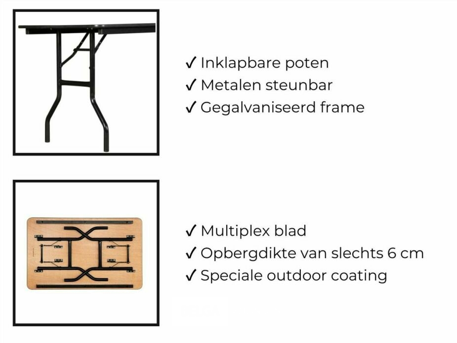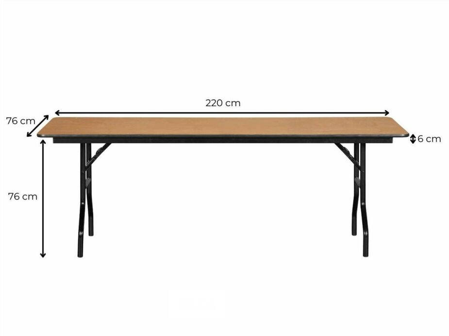 Deze uiterst professionele buffettafel is snel opzetbaar en kan dankzij de inklapbare poten compact opgeborgen worden. De tafel is 76 cm hoog en het tafelblad uit multiplex van 18 mm dik meet 220 x 76 cm. Het stevige frame is gemaakt uit buizen uit gegalvaniseerd en gecoat staal met een diameter van 32 mm en een wanddikte van 2 mm. Dankzij de metalen steunbar in het midden is de tafel extra sterk en kan deze tot wel 200 kg gewicht dragen. De buffettafel is gemakkelijk in onderhoud en stootvast en heeft bovendien een speciale coating gekregen zodat de tafel ook buiten gebruikt kan worden. Je laat de tafel echter wel beter niet het hele jaar buiten staan. De klaptafel is snel opzetbaar en kan compact gestockeerd worden dankzij zijn opbergdikte van slechts 6 cm.