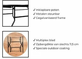 Deze professionele ronde buffettafel is onmisbaar op elk feestje. Je kan de tafel snel en gemakkelijk opzetten en weer opbergen. De tafel is 76 cm hoog en het tafelblad uit multiplex van 18 mm dik heeft een diameter van 122 cm. Het stevige frame is gemaakt uit buizen uit gegalvaniseerd en gecoat staal met een diameter van 32 mm en een wanddikte van 2 mm. Dankzij de metalen steunbar in het midden is de tafel extra sterk en kan deze tot wel 200 kg dragen. De buffettafel is gemakkelijk in onderhoud en stootvast en heeft bovendien een speciale coating gekregen zodat de tafel ook buiten gebruikt kan worden. Je laat de tafel echter wel beter niet het hele jaar buiten staan. De klaptafel is snel opzetbaar en kan dankzij de inklapbare poten compact gestockeerd worden met een opbergdikte van slechts 11,5 cm.