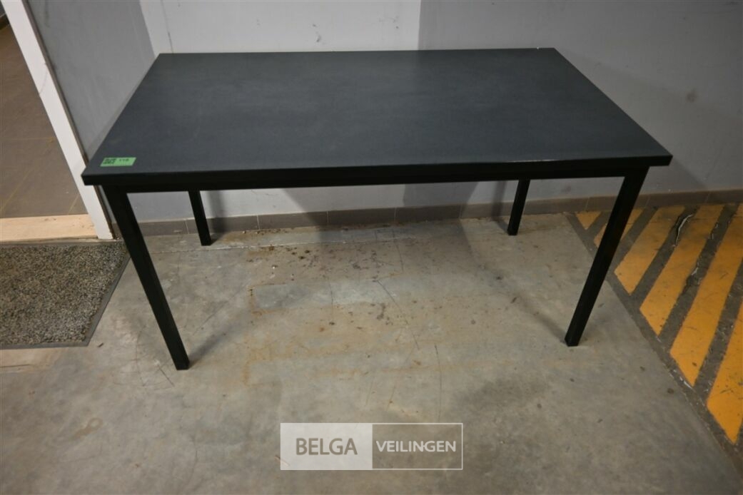 Tafel, Donkergrijs houten blad en zwarte metalen poten, afm 140 x 80 x 78cm