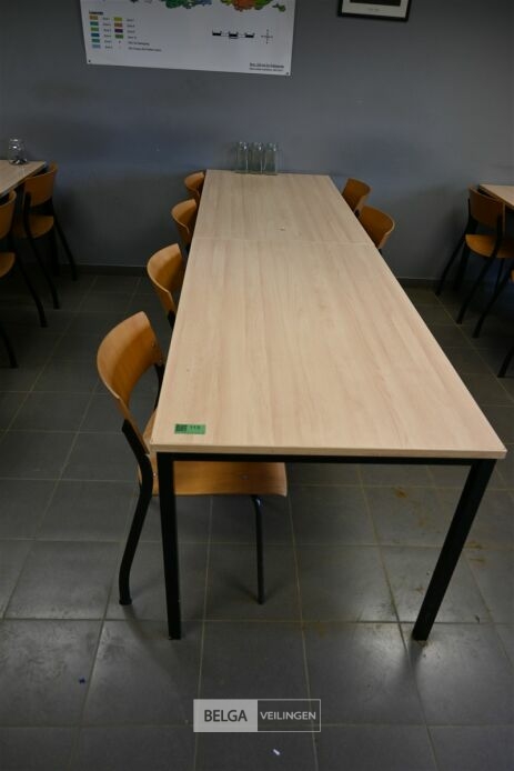 Tafels en Stoelen, 2 tafels berken laminaat en zwarte metalen poten, 7 stoelen houten zitting met zwart metalen frame