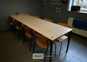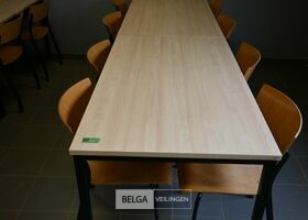 Tafels en Stoelen, 2 tafels berken laminaat en zwarte metalen poten, 8 stoelen houten zitting met zwart metalen frame