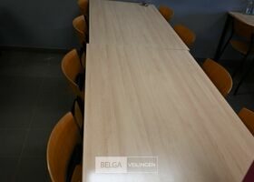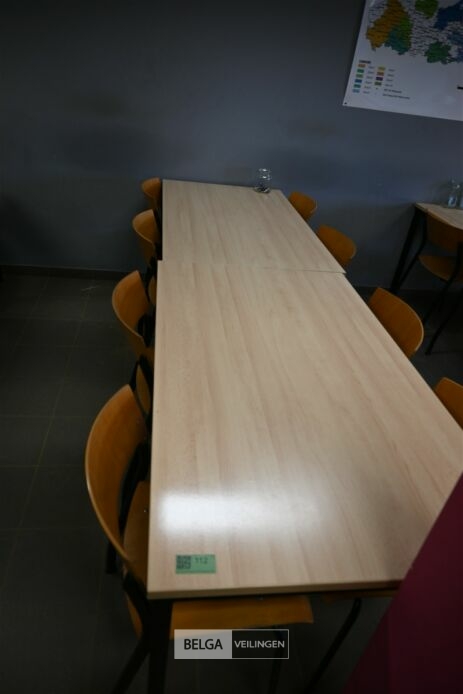 Tafels en Stoelen, 2 tafels berken laminaat en zwarte metalen poten, 8 stoelen houten zitting met zwart metalen frame
