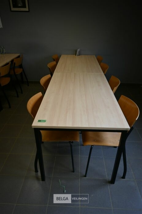 Tafels en Stoelen, 2 tafels berken laminaat en zwarte metalen poten, 8 stoelen houten zitting met zwart metalen frame