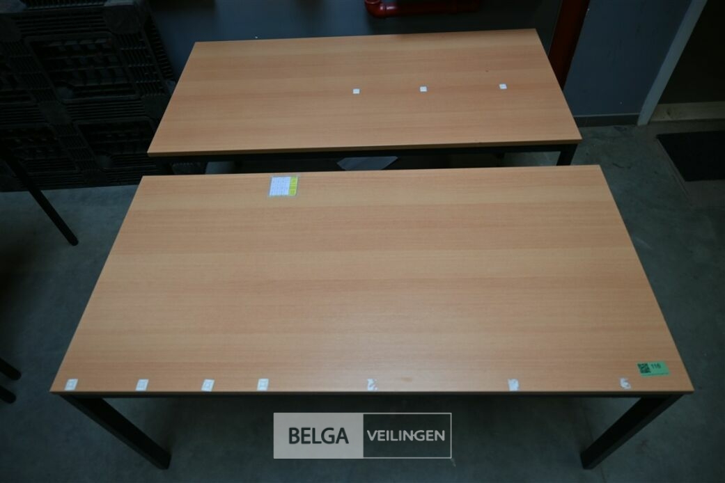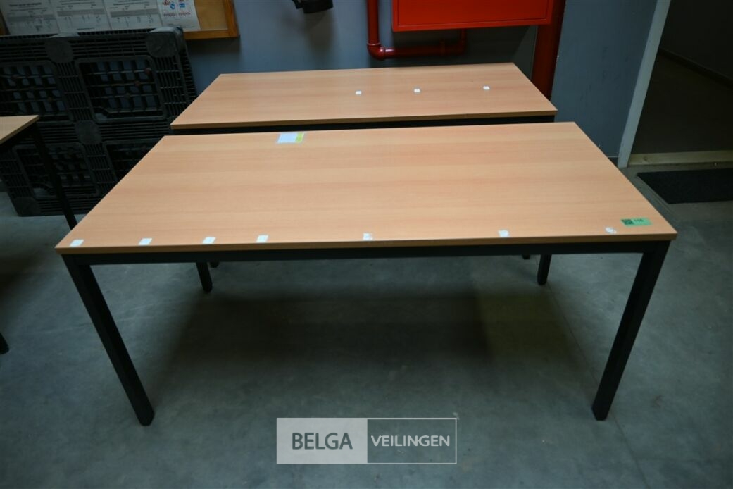 Tafels: Bruin berken laminaat blad en zwarte metalen poten, afm 160x80x75 cm