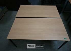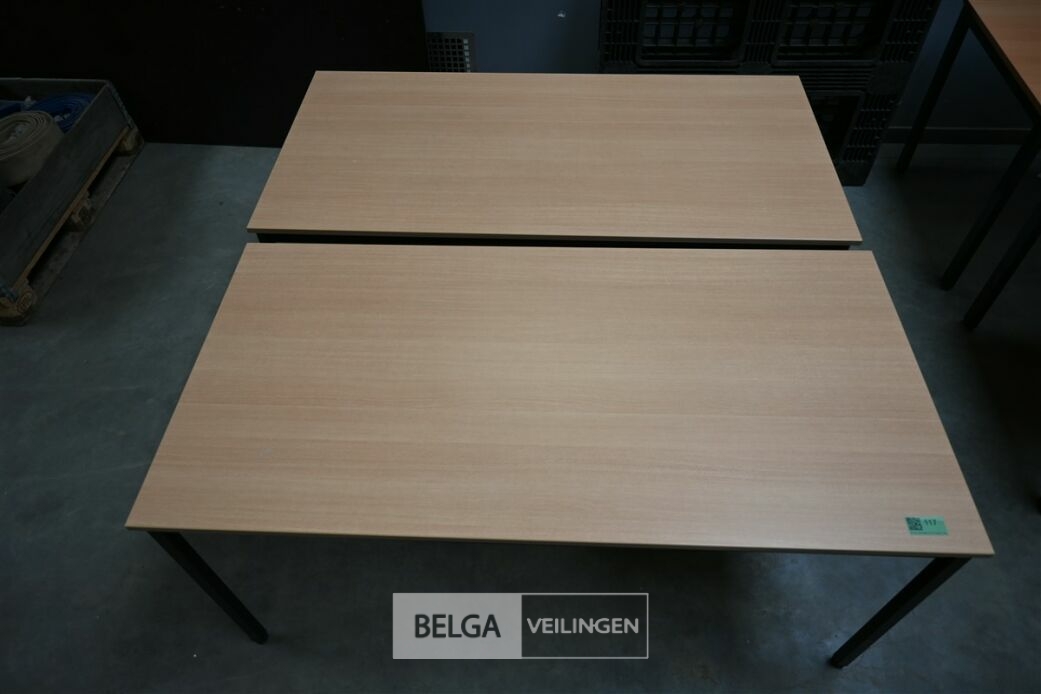 Tafels: Bruin berken laminaat blad en zwarte metalen poten, afm 160x80x75 cm