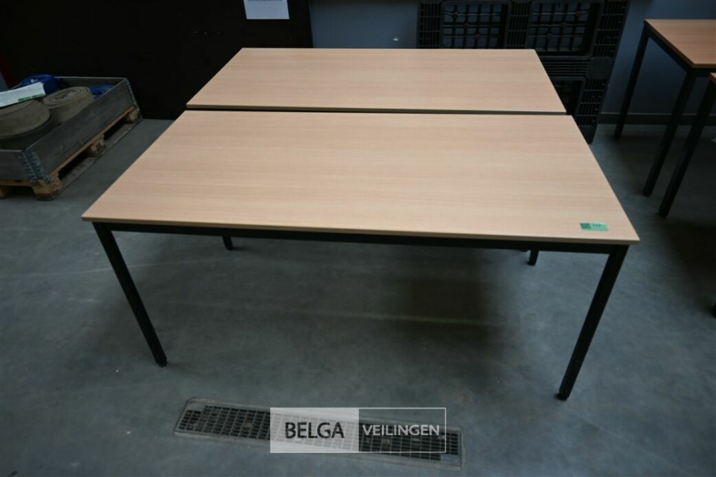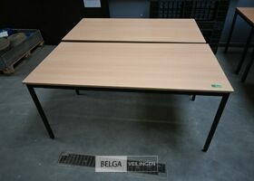 Tafels: Bruin berken laminaat blad en zwarte metalen poten, afm 160x80x75 cm