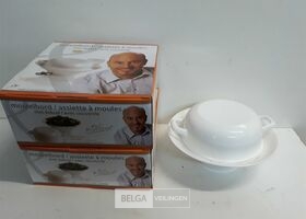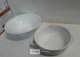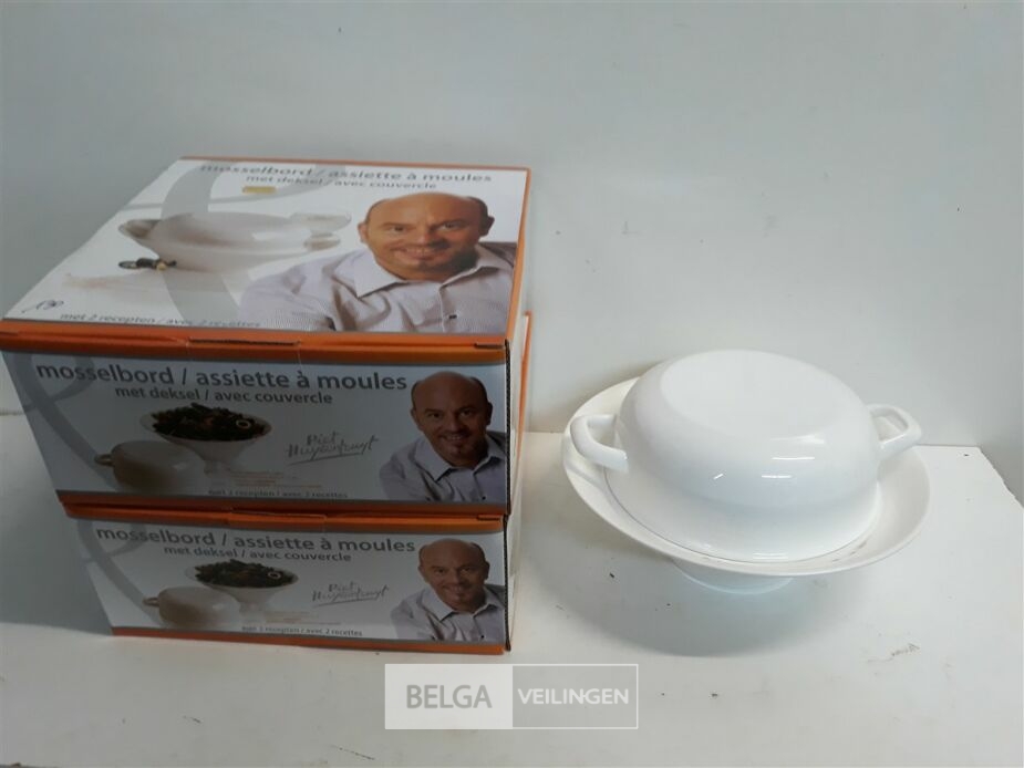2 x Piet Huysentruyt mosselbord 28x9 cm met deksel 20x7,5 cm porselein vaatwasbestendig