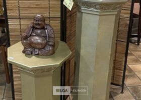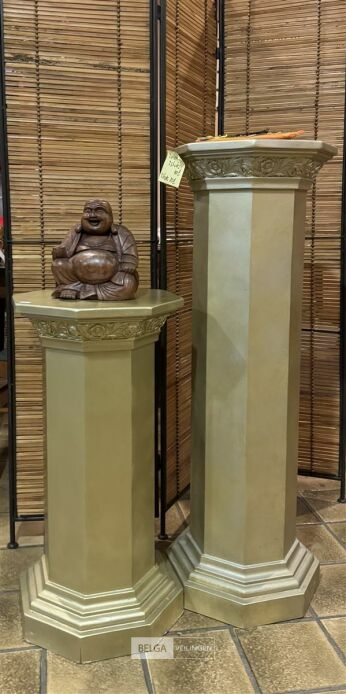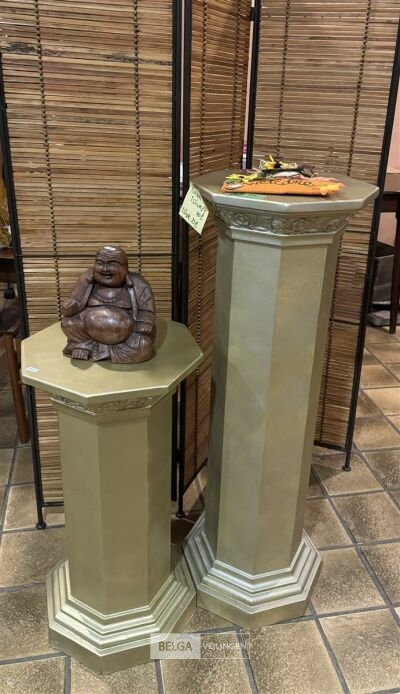 2x achthoekige sokkels, goudkleurig incl decoratie - afm sokkels : kleinste: Ø 37 x H 74 cm - grootste : Ø 37 x H 107 cm