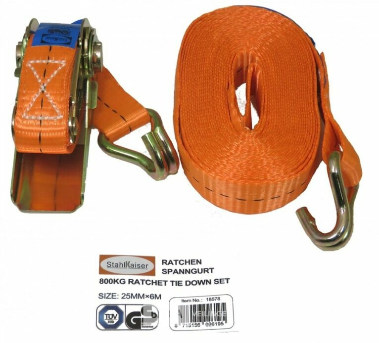 2xSpanband 6 mtr. met ratel/haken 800 kg.-geschikt voor gebruik bij elke aanhanger of caravan