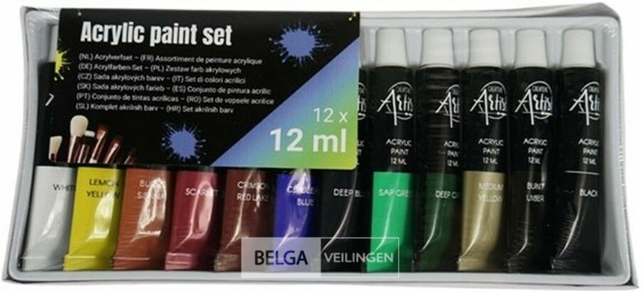 Acrylverf schildersverf tube 12 ml set van 12 stuks, geschikt op canvas, linnen schildersdoeken of schildersboard,