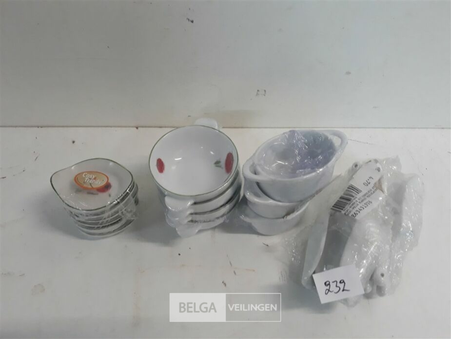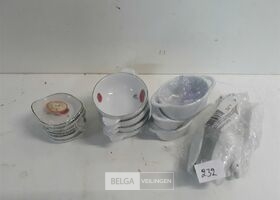 4 x Aperoset porselein 1 x rond 6 cm 6 stuks + 1 x rond 8 cm 4 stuks + 1 x ovaal 7x5 cm 3 stuks + 1 x Lepel 12 cm 6 stuks