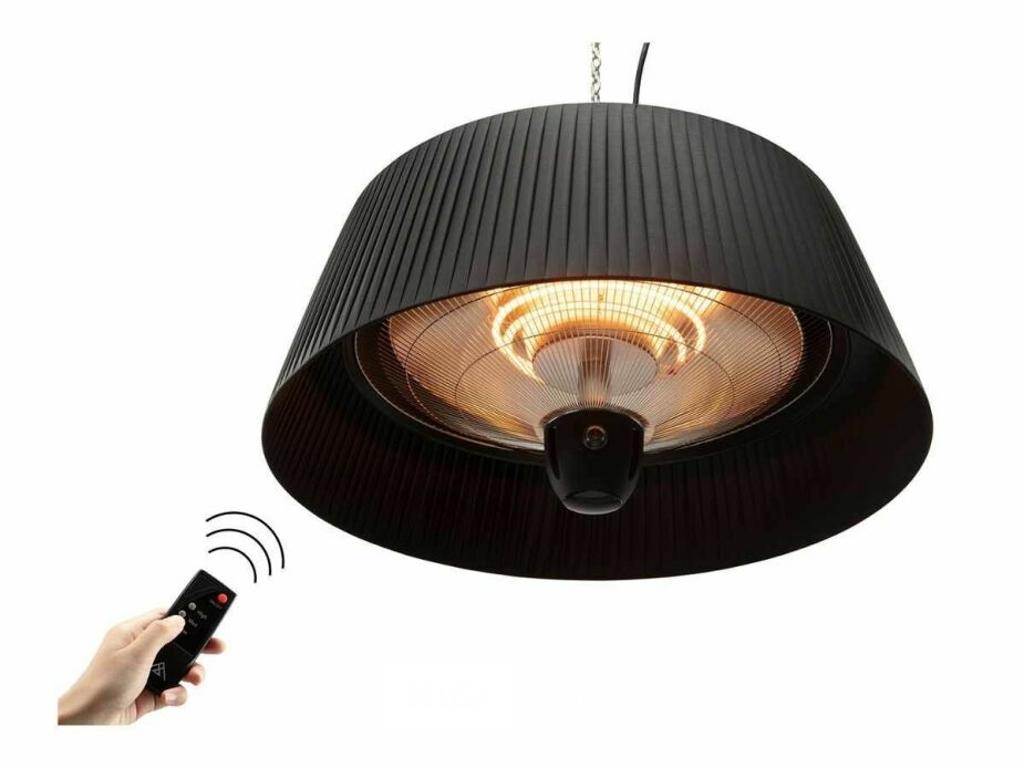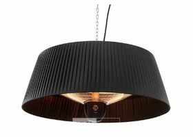 Deze hangende elektrische terrasverwarmer met zwarte kap kan je ophangen in je tent of aan je parasol. Of elders, want er zijn tal van mogelijkheden, aangezien deze verwarmer zowel voor binnen- als buitenshuis gebruik geschikt is. Met de bijgeleverde afstandsbediening kan je de verwarmer gemakkelijk vanuit je stoel bedienen. Dankzij drie warmtestanden kies je zelf hoe veel warmte je wil creëren: 800, 1200 of 2000 Watt. De verwarmer heeft een aluminium behuizing met matzwarte afwerking en is spatwaterdicht (IP-norm: IPX4). Het verwarmingselement heeft een diameter van 42 cm, de kabel heeft een lengte van 1,60 m.