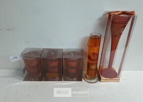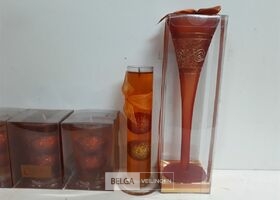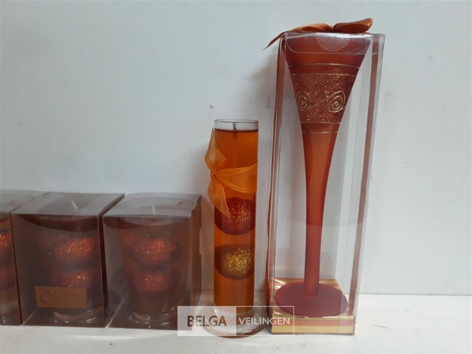 5 x Kaars oranje in glas met deco 3 assorti