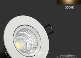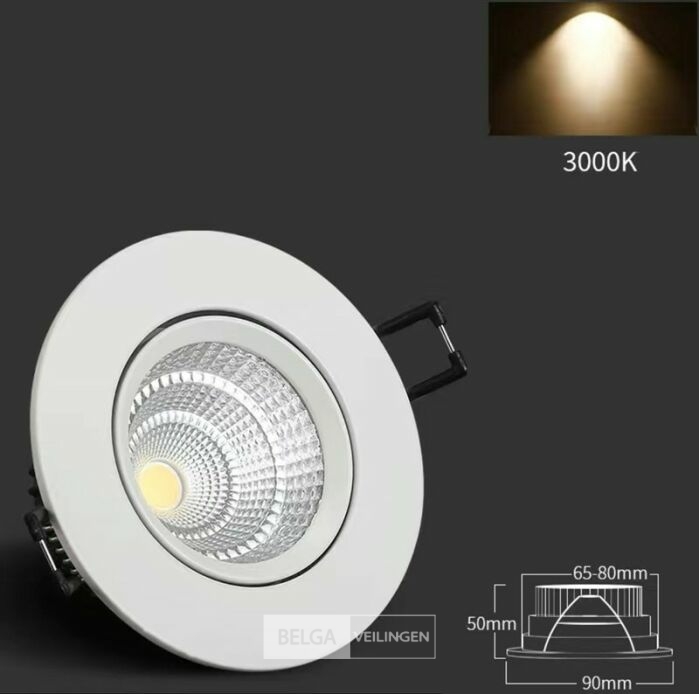 50 x Verstelbare inbouwspot -LED COB -7W - 3000K -Rond -Kleurtemperatuur : 3000K - Lumen : 630 - Afmetingen/mm : 85 x 70 mm - Spanning : 220-240V (50/60Hz) - IP-waarde : IP20 - Installatiediameter : 70 mm - Levensduur/uren : 30.000 -Kleur : wit - Stralingshoek : 40°