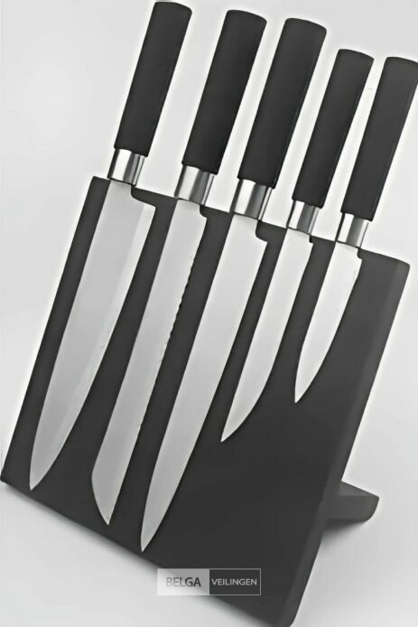 6-delig Messenset : Koksmes 20 cm (1,5 mm) Broodmes 20 cm (1,5 mm) Snijmes 20 cm (1,5 mm) Universeel mes 13 cm (1,2 mm) Schilmesje 7,6 cm (1,2 mm) Magnetische messenhouder.