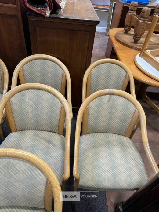 8 houten stoelen met stoffen bekleding , zithoogte stoel : ± 46 cm