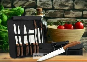 Compleet koksmessenset: Deze set van 9 stuks bevat zeven essentiële messen, een messenslijper en een trancher vork,