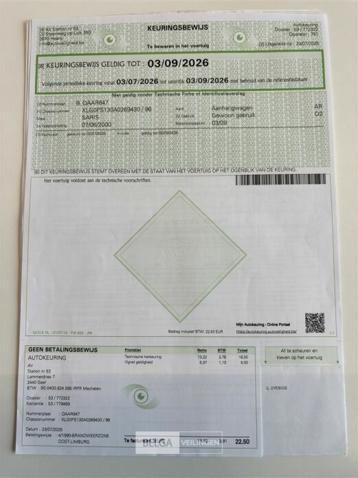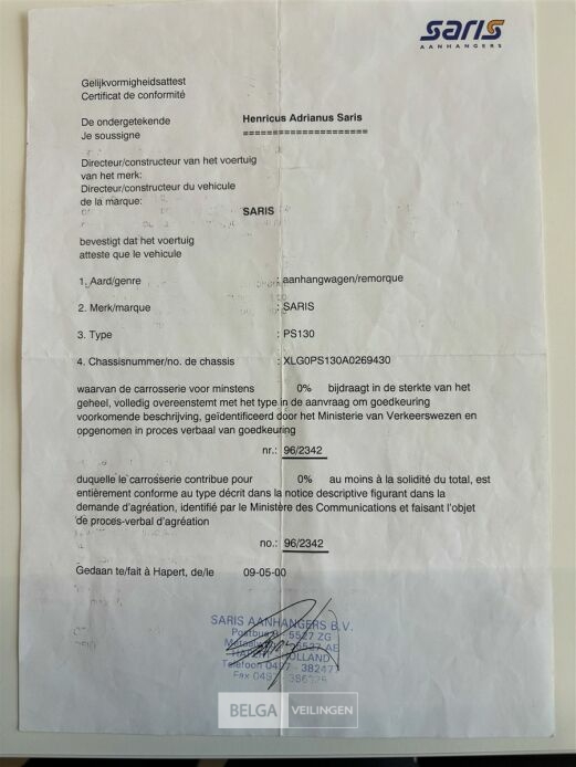 Aanhangwagen Saris, geremd, L. 2,78 x B. 1,56, PVA Gewicht 1350 Kgr. , type PS130, enkel as