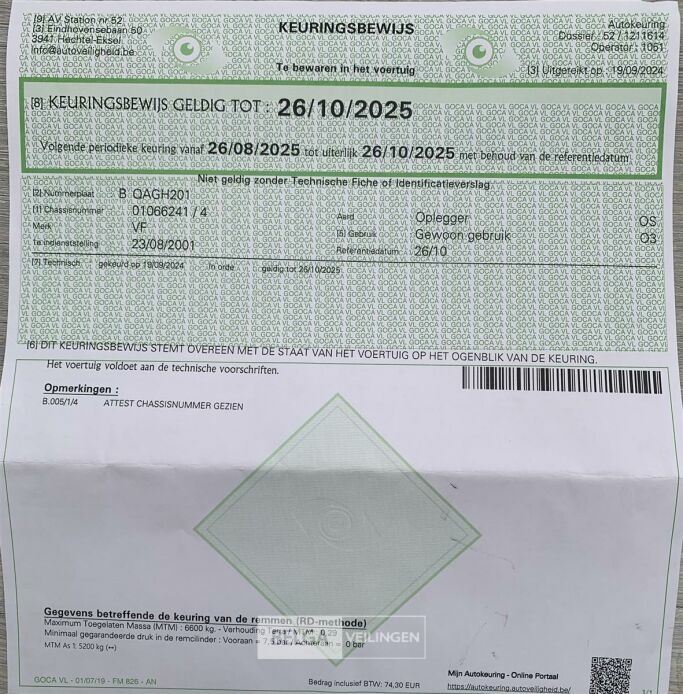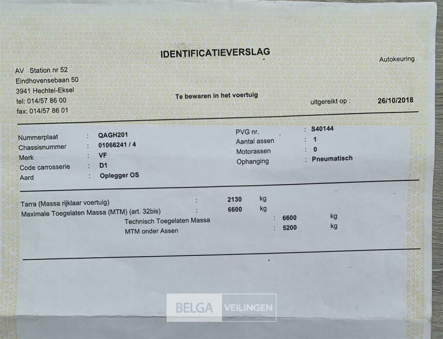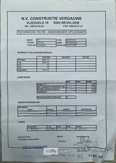 | Opmerkingen: | Afmetingen aangangwagen: 8.30 x 2.25 m. De aanhangwagen heeft een plaatkoppeling. Op de aanhangwagen staat een zware takel gemonteerd met een capaciteit van 8165 Kg, 12 Volt. De aanhangwagen verkeert in goede staat. |