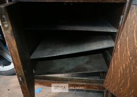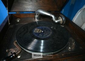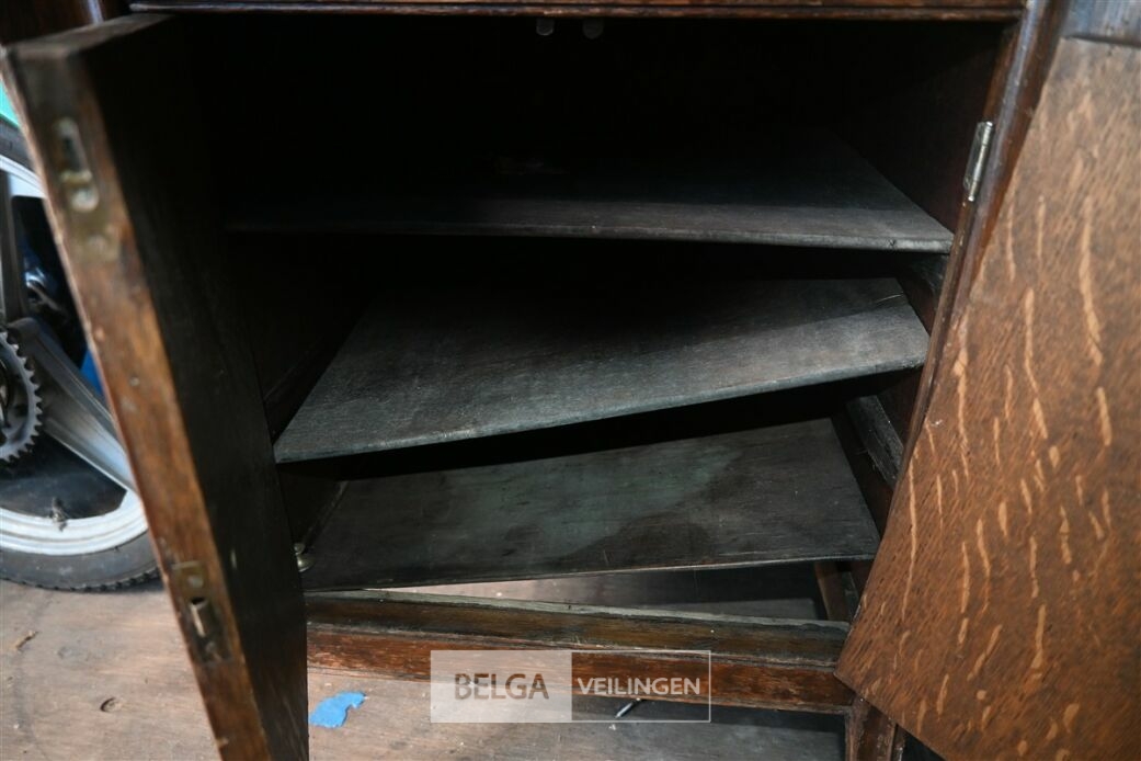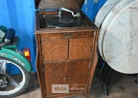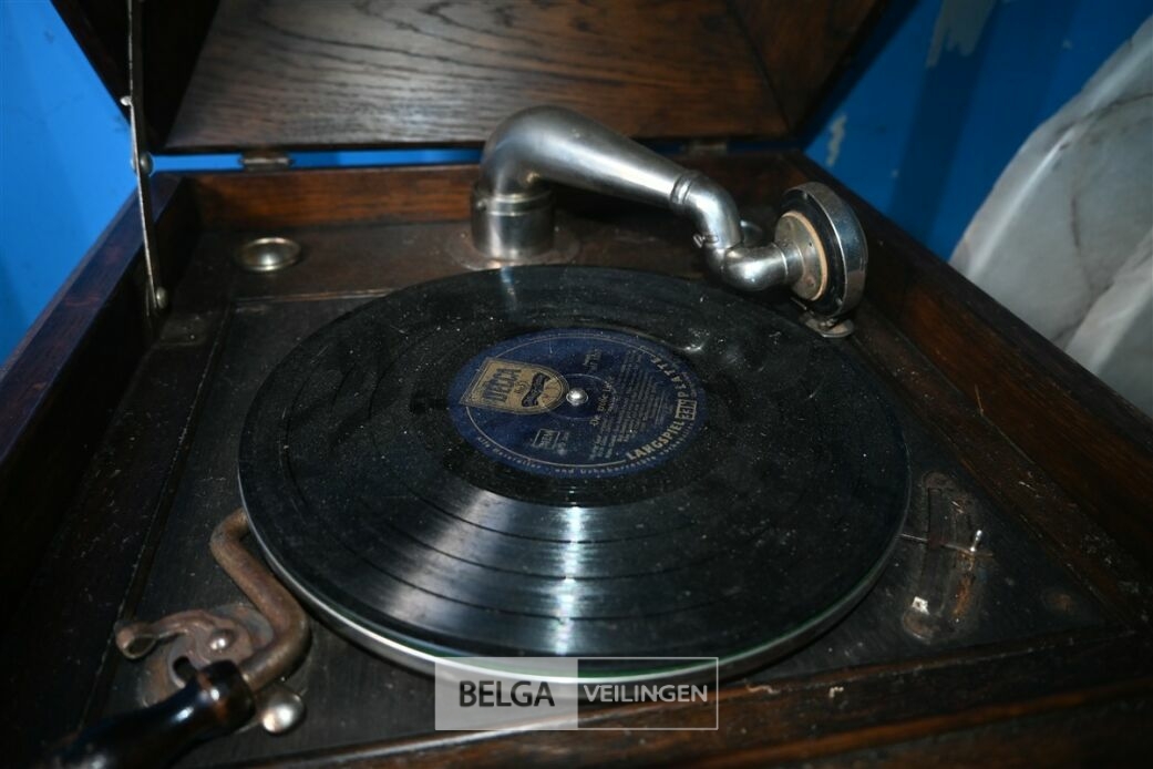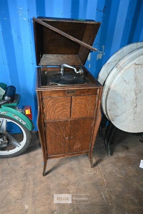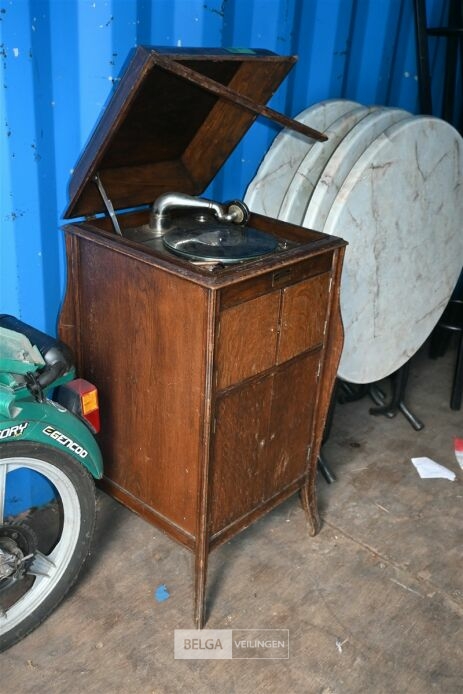 Antieke platenspeler, waarvaan het kastje beschadigd is. H 96 x 44 X 44