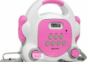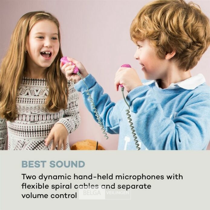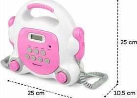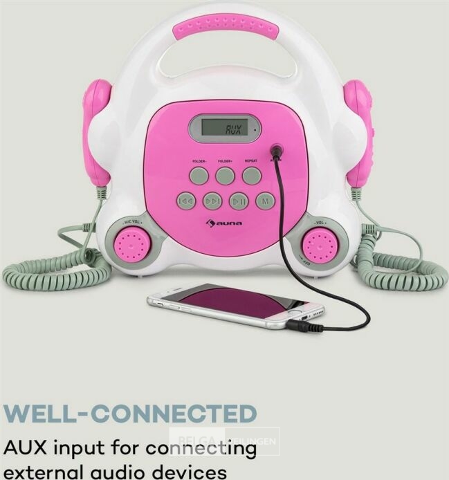 Auna Pocket Rocker BT karaoke speler BT-USB-poort MP3 - 2x microfoon - roze. Als goed uitziend karaoke-apparaat treedt de Pocket Rocker BT met twee dynamische microfoons en spiraalsnoeren plus aparte volumeregelaar op. Met behulp van de geïntegreerde Bluetooth-functie worden alle titels van de audiobestanden van smartphone, tablet of laptop draadloos en gemakkelijk via de Pocket Rocker BT gestreamd. De USB-poort maakt bovendien het afspelen van MP3's van USB-sticks of MP3-spelers mogelijk, terwijl via de AUX-ingang externe audio-apparaten zoals bijvoorbeeld een cd-speler aangesloten kunnen worden. De genoemde omvang met functies en het op de doelgroep gerichte design maken de auna Pocket Rocker BT bovendien interessant als primaire uitrusting in kinderkamers. De afgeronde behuizing is volledig vrij van scherpe hoeken of uitstekende onderdelen om verwondingen te voorkomen. Met de grote bedieningselementen kunnen ook kleine kinderhanden gemakkelijk het volume lichtjes aanpassen. De auna Pocket Rocker kan zowel met een elektriciteitssnoer alsook met batterijen worden gebruikt. In batterij-modus verandert hij dankzij de handzame handgreep van een stationair apparaat met een kleine bewegingsmogelijkheid tot een uiterst mobiele begeleider.