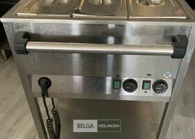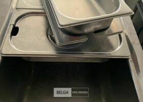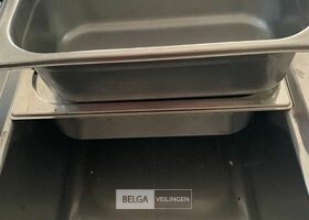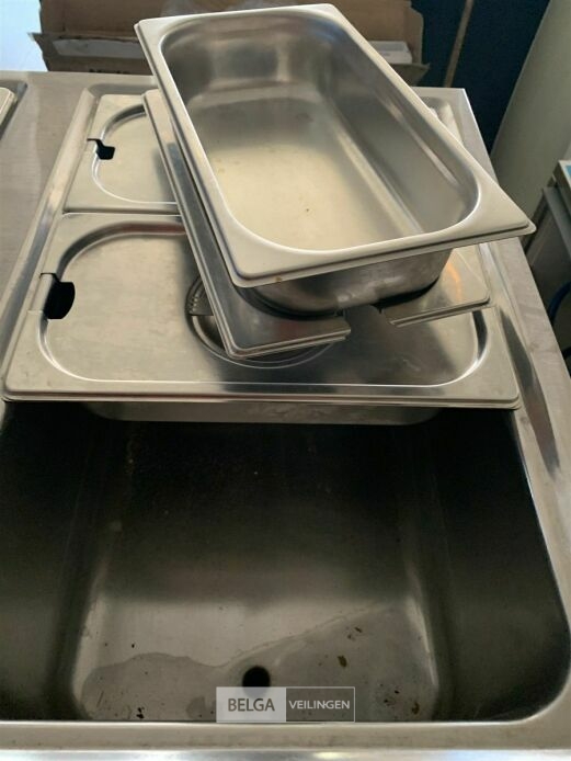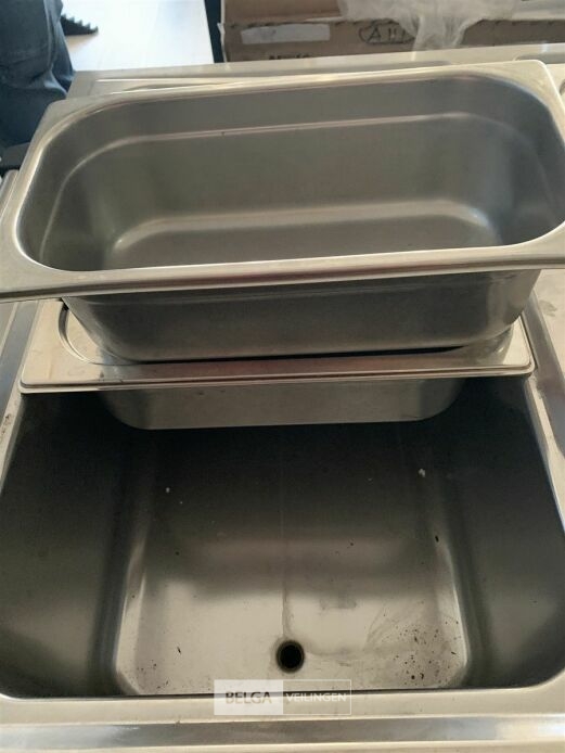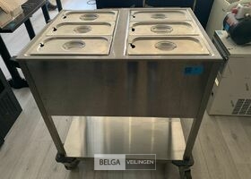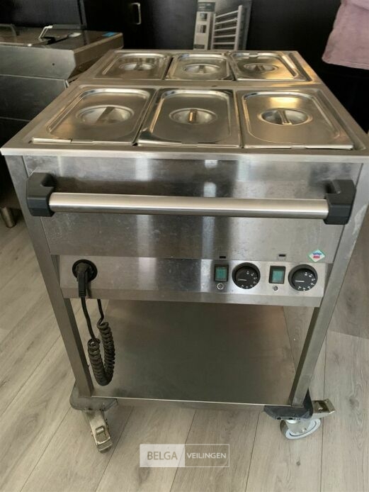 Inox Bain-Marie wagen op wielen, biedt ruimte voor 6 x GN 1/2 container. 220v, L 83 x D 60 x H 90 cm. Verdere technische gegevens niet gekend. Het aangeboden kavel werd niet onderzocht op gebreken en niet getest op werking. Maak gebruik van het kijkmoment om u te voorzien van de nodige indrukken.