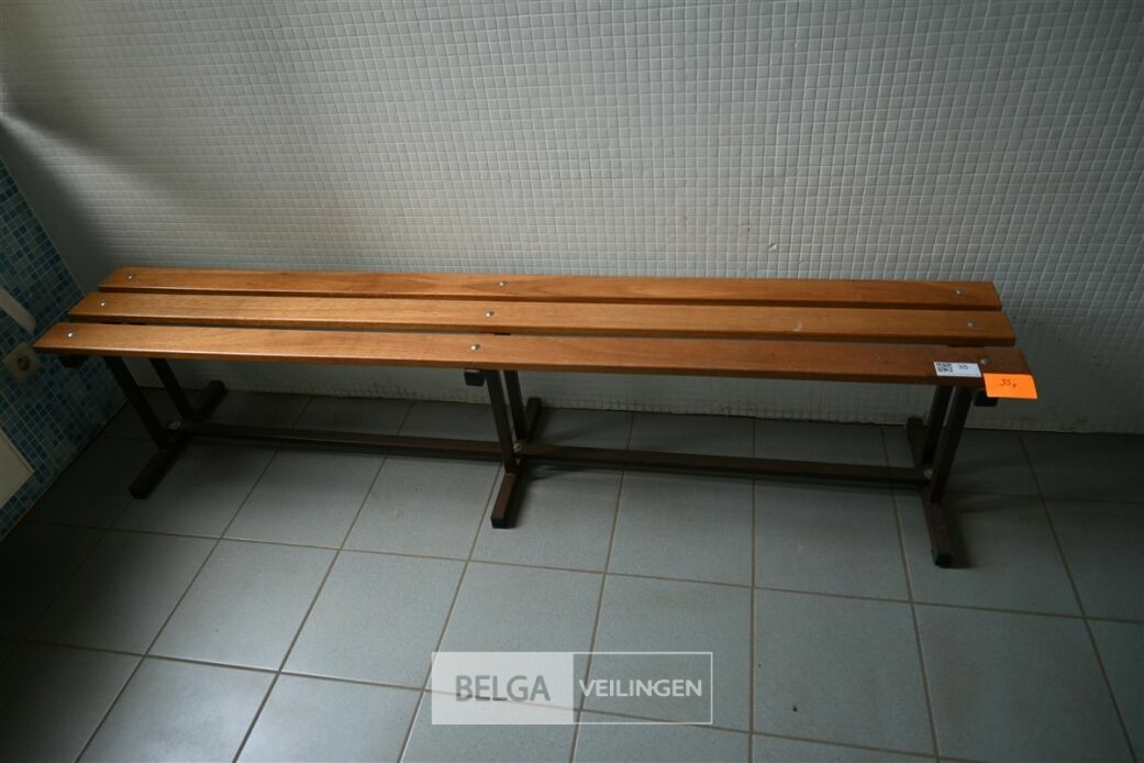 1 Houten bank met bruin metalen onderstel, afm ±200x41x45 cm (kavel te vinden op 1ste verdiep)