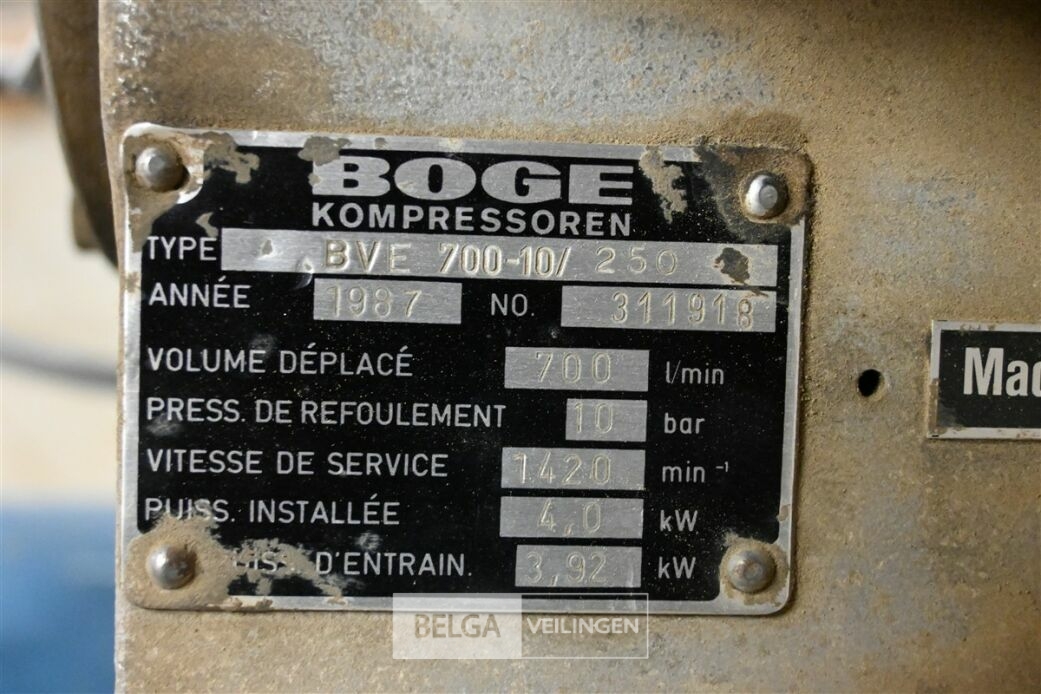 Boge Compressor BVE 700/10/250, Bouwjaar 1987, 380V, 4Kw. Werkdruk 10 bar. OPGELET: De werking van het artikel is onbekend en niet getest. Het artikel kan geïnspecteerd worden tijdens de kijkdag. Het artikel wordt verkocht in de staat waarin het zich bevindt, met zichtbare en onzichtbare gebreken.