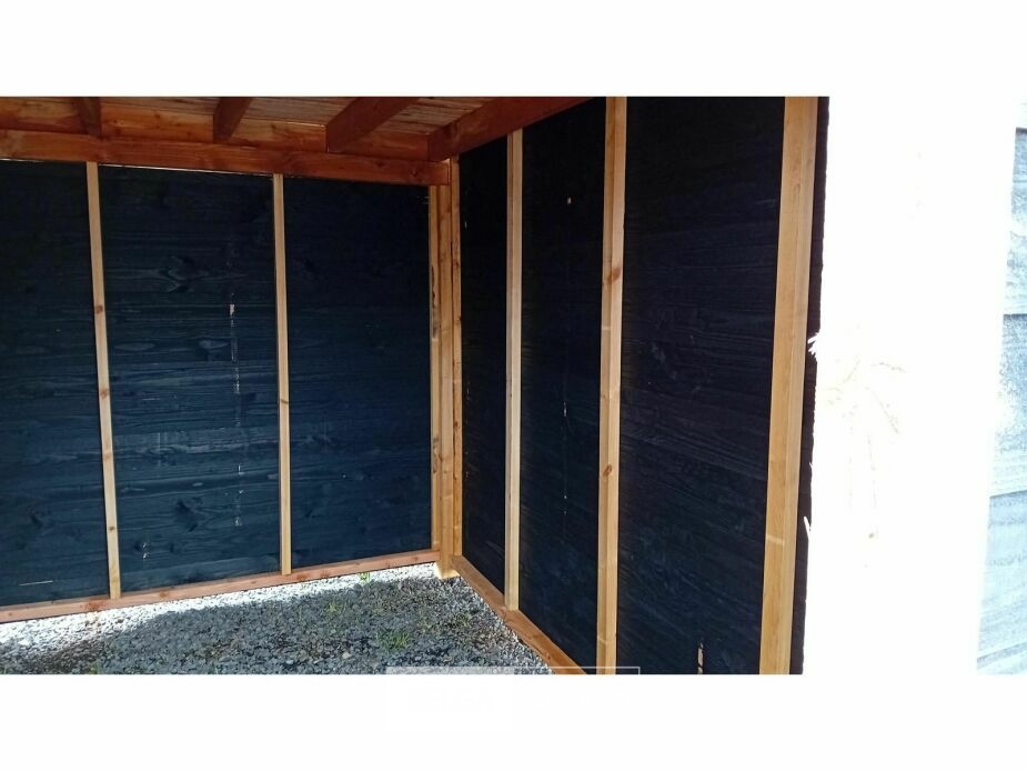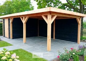 Buitenverblijf met berging Palen 15x15cm douglas fijnbezaagd. Dakligger 12x12 douglas fijnbezaagd. Dakbalken 5x15 douglas fijnbezaagd. Dakplanken douglas 18 mm dik. Wanden zwart zweeds rabat ( dakleer en grondankers niet mee geleverd ) Dakmaat 900x500cm Maat B: 250cm Maat A: 542cm Maat C 442cm