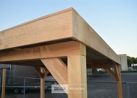 10 stuks Palen douglas 120x120mm fijnbezaagd,Ligger douglas 120x120mm fijnbezaagd,Dakbalken douglas 50x150mm fijnbezaagd,overdak 18 mm dik trand froef planken hieroverheen dakleer ( brand rol) geleverd incl. bevestigings materiaal en handleiding ( niet in begrepen beton poeren )