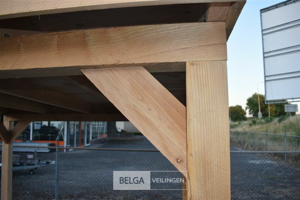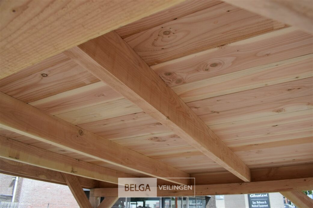6 stuks Palen douglas 120x120mm fijnbezaagd,Ligger douglas 120x120mm fijnbezaagd,Dakbalken douglas 50x150mm fijnbezaagd,overdak 18 mm dik trand froef planken hieroverheen dakleer ( brand rol) geleverd incl. bevestigings materiaal en handleiding ( niet in begrepen beton poeren )