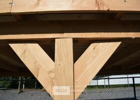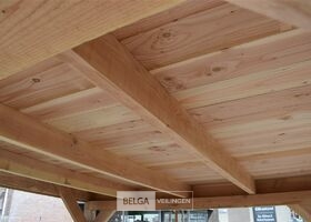 8 stuks Palen douglas 120x120mm fijnbezaagd,Ligger douglas 120x120mm fijnbezaagd,Dakbalken douglas 50x150mm fijnbezaagd,overdak 18 mm dik trand froef planken hieroverheen dakleer ( brand rol) geleverd incl. bevestigings materiaal en handleiding ( niet in begrepen beton poeren )