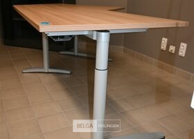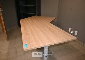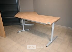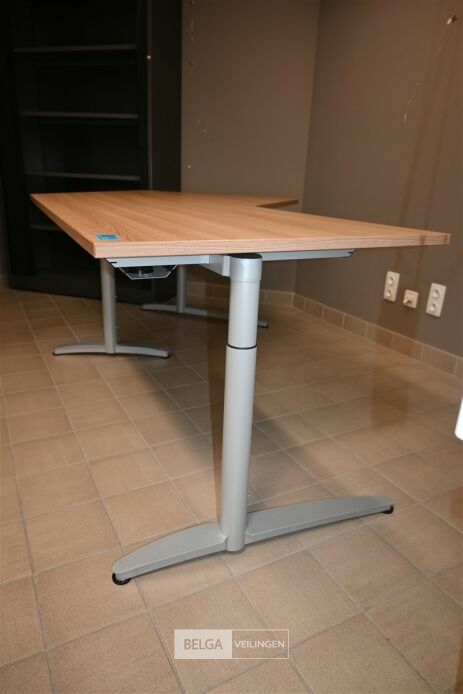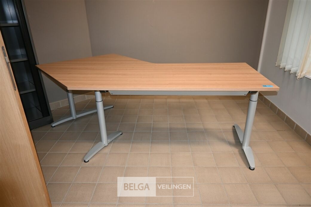 Bureau in L-vorm, afm 160x100cm, breedte 80cm en hoogte 76cm. Opgelet! Dit lot bevindt zich op de eerste verdieping en dient door de koper zelf naar beneden te worden gebracht.