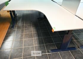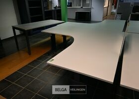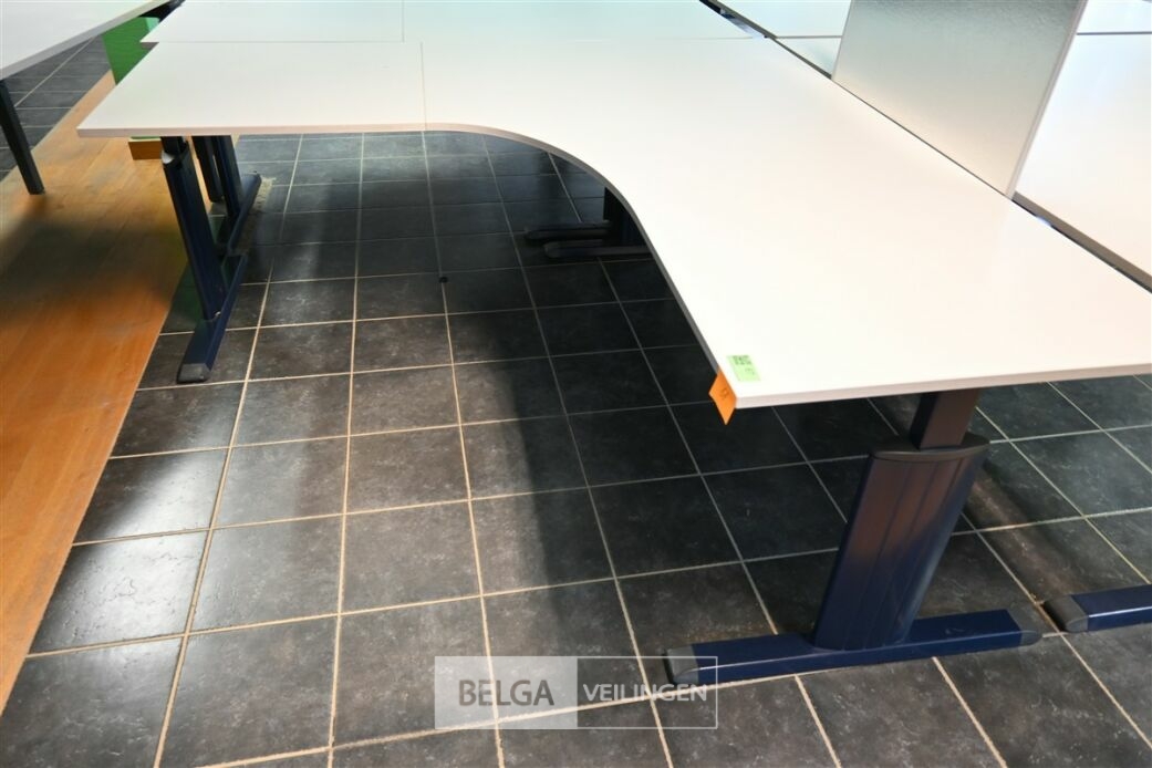 Lichtgrijs met blauwe voet, bureau hoek 90° met ronding, afm 200/200 x 80/80 x 75 cm, mechanisch in hoogte regelbaar