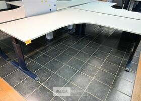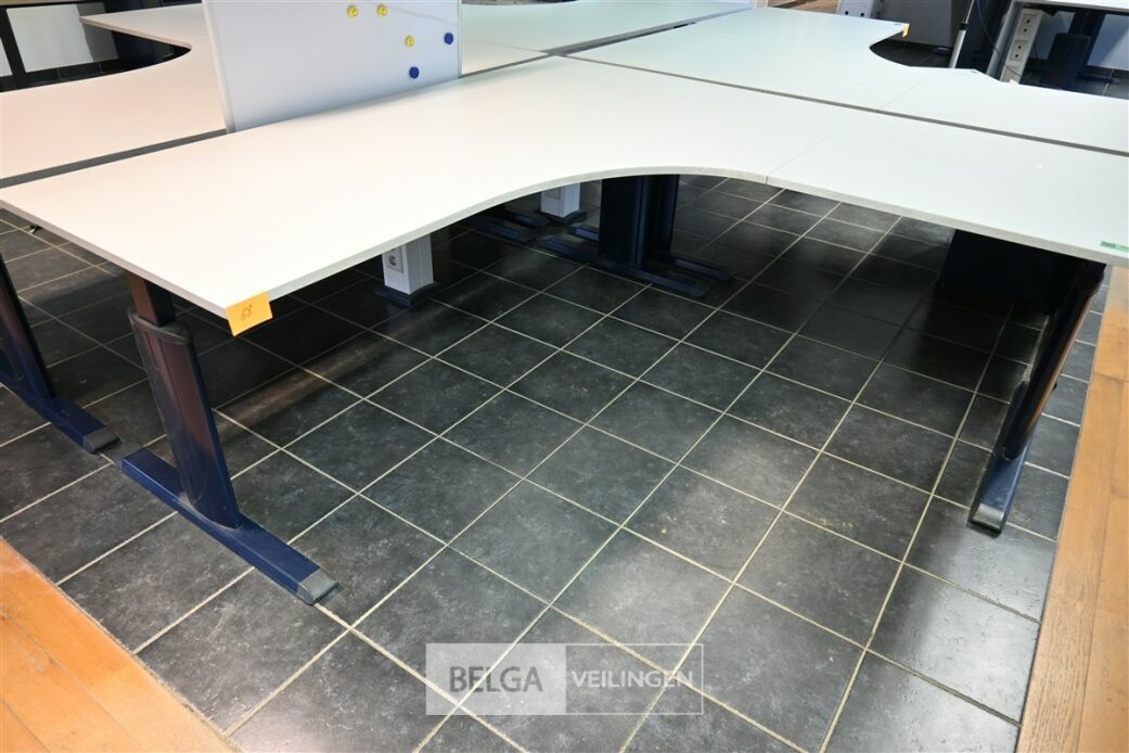 Lichtgrijs met blauwe voet, Bureau hoek 90° met ronding, afm 200/200 x 80/80 x 75 cm, mechanisch in hoogte regelbaar