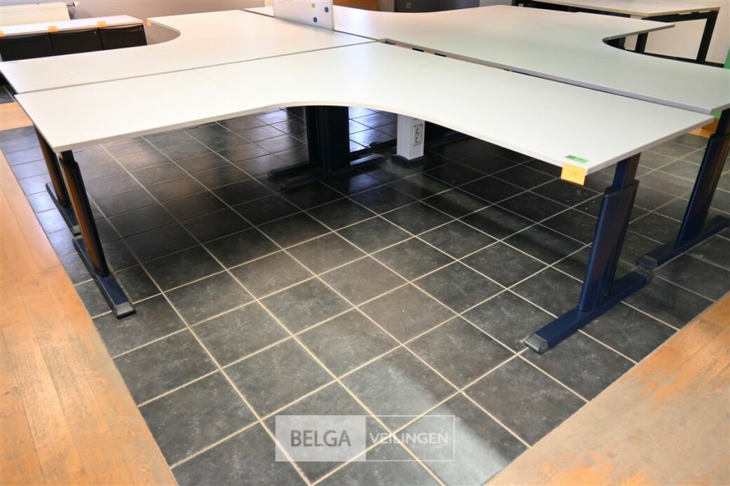 Lichtgrijs met blauwe voet, bureau hoek 90° met ronding, afm 200/200 x 80/80 x 75 cm, mechanisch in hoogte regelbaar