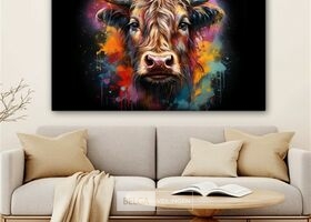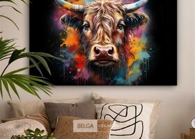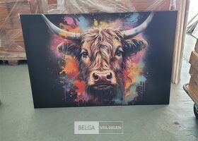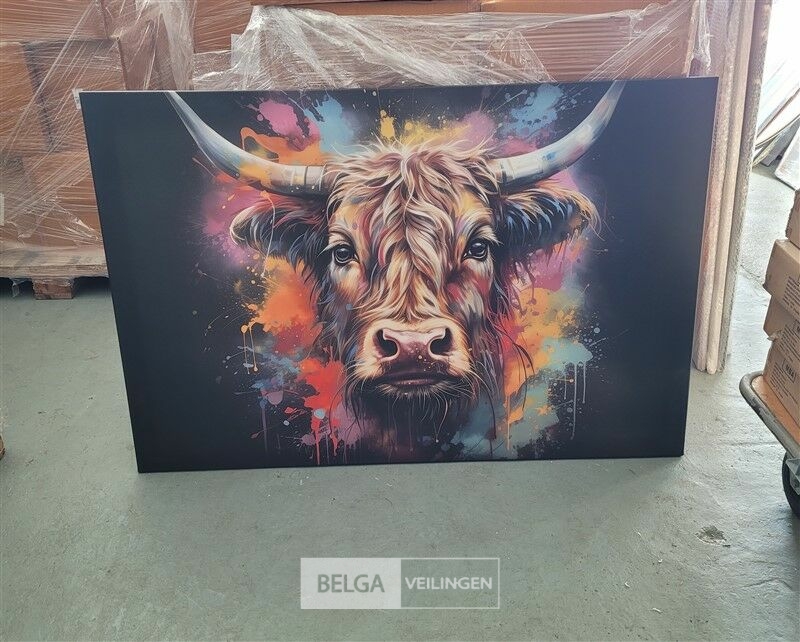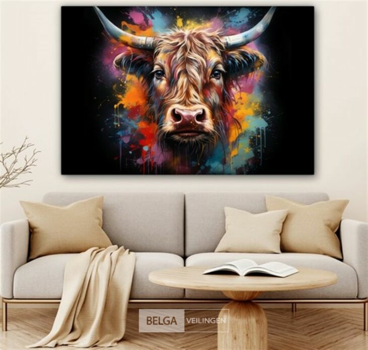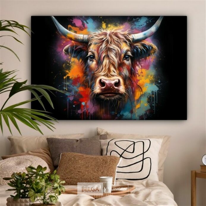 Canvas schilderij 150x100 cm - Wanddecoratie Graffiti - Schotse hooglander - Zwart - Koe - Muurdecoratie woonkamer - Slaapkamer decoratie